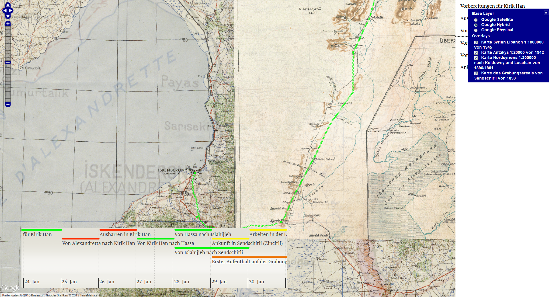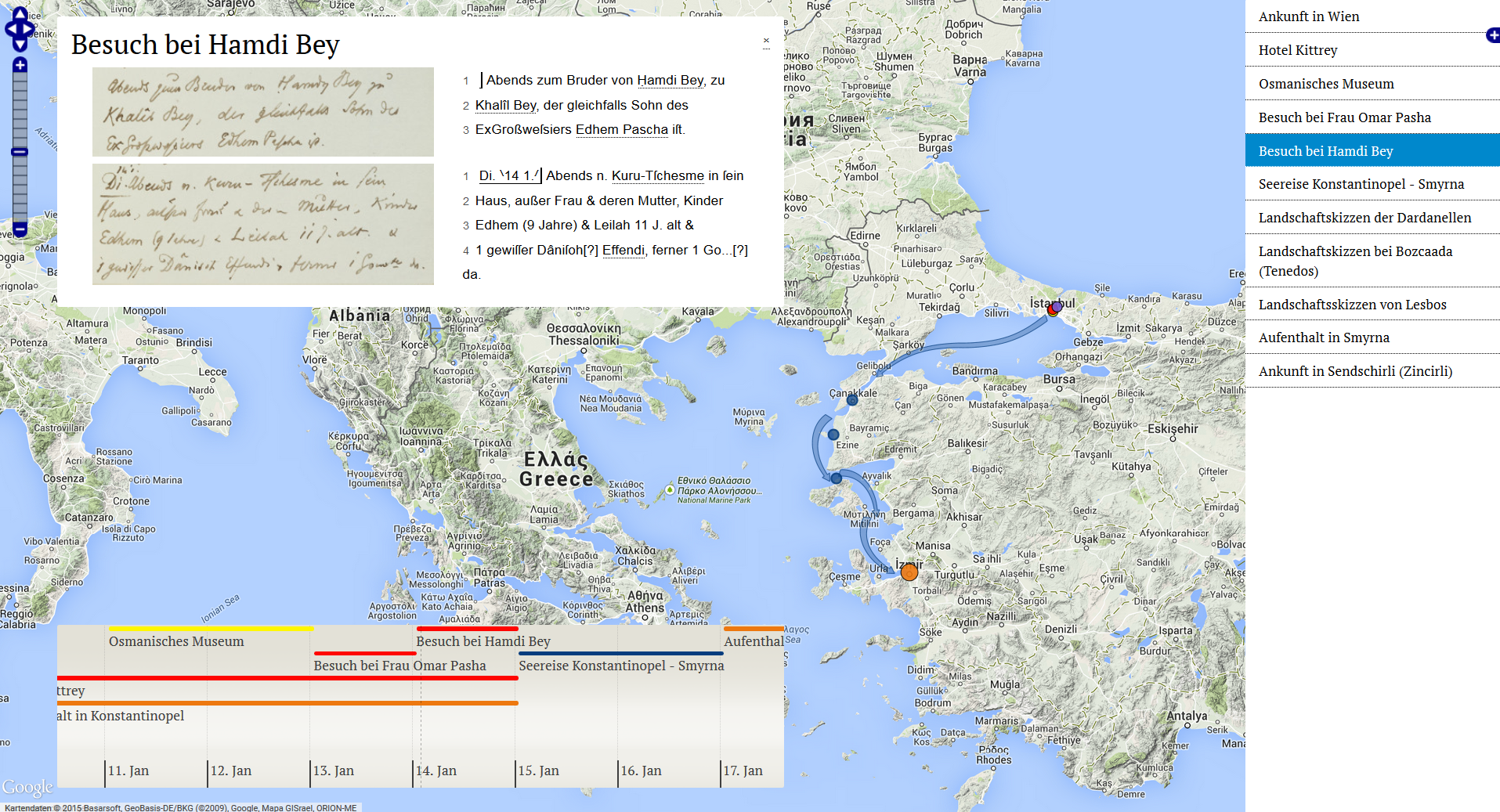 This system is based on the web-framework Neatline,developed at the University of Virginia, which is able to manage and visualize heterogeneous data in a common interface. The system was extended with a functionality to store and display XML-encoded texts according to the recommendations of the Text Encoding Initiative (TEI). Furthermore, every entry in the journals is connected to a date or a time-span displayed in a timeline which could also be used to access the text. Beyond this, it is possible to upload or to link scientific articles to monuments, artifacts or archaeological sites mentioned by Euting. All geographical information in the diary can be directly connected to different maps provided within the system.[1] http://ecenter.uni-tuebingen.de:8012/neatline/fullscreen/start