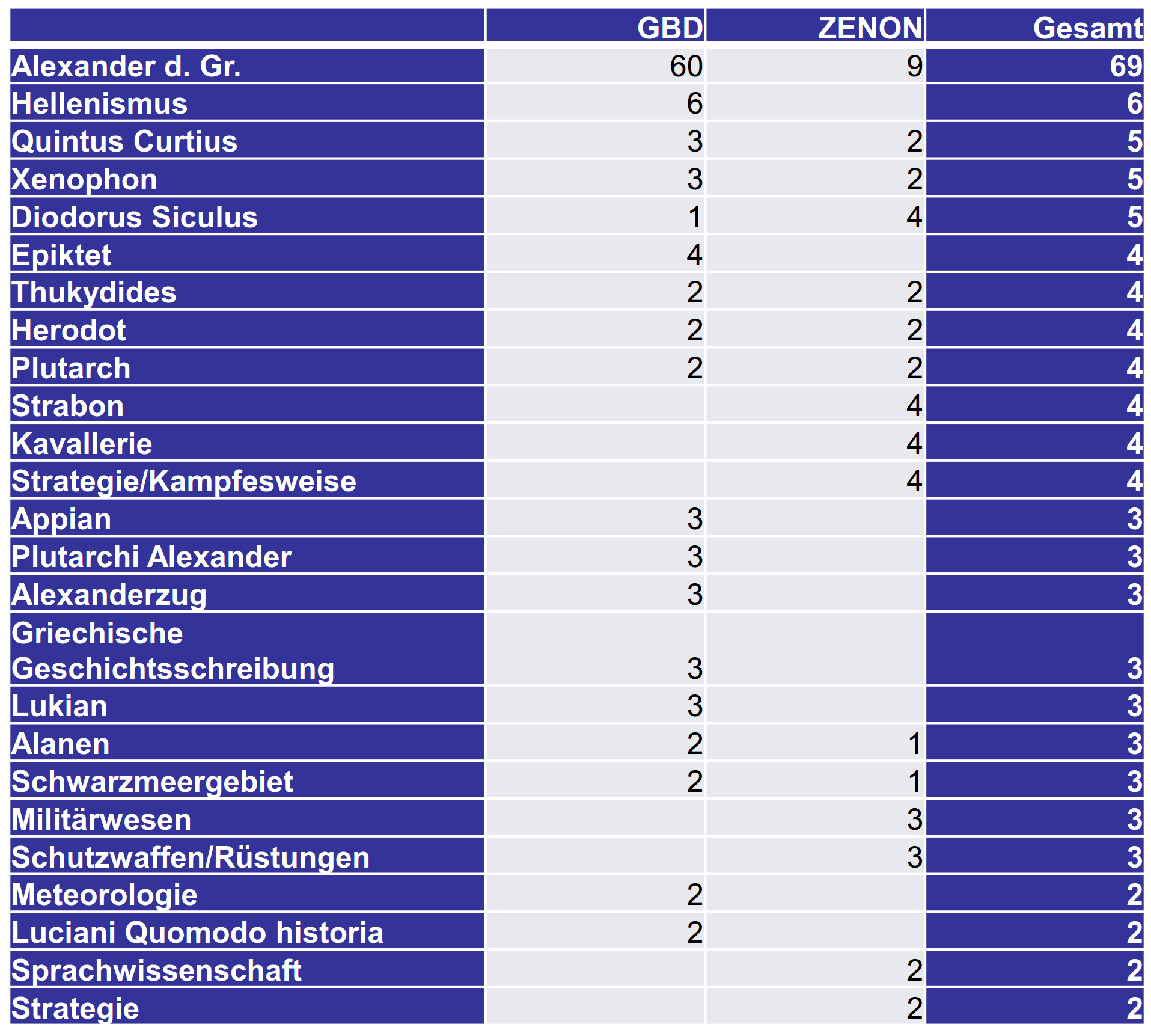 The paper explores the potential of data mining in bibliographic records. Quantitative analsysis of co-occurrences of keywords in bibliographic records makes it possible to create a semantic network. In contrast to the rigid hierarchy of traditional thesauri, this network maps polyvalent semantic relations between keywords across the distinct thematic branches of a thesaurus tree. Analysis of a comprehensive data pool made up from two major bibliographies (Gnomon Bibliographic Database and ZENON DAI) should allow for the semantic mapping of a core set of central topics (people, places, social structures, concepts) of classical scholarship.Statistiken