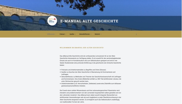 The eManual Alte Geschichte is a digital introduction to Ancient History and contains mostly Open Educational Resources. Users can learn about Ancient history by using podcasts, ancient sources in translation (and with comments), secondary literature, and other material (such as lists of Roman emperors). Under the direction of Werner Riess, a team of seven contributors created the contents and layout of the blog from November 2015 until June 2017. In a second phase of the project in 2018, the blog will be extended and re-launched in 2019.