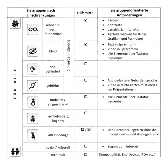 Abb. 1: Anforderungen an Barrierefreiheit im Web nach Zielgruppen (nach Janschitz 2012, 75: Ausschnitt aus Tab. 3.8, dort mit weiteren Quellenangaben)