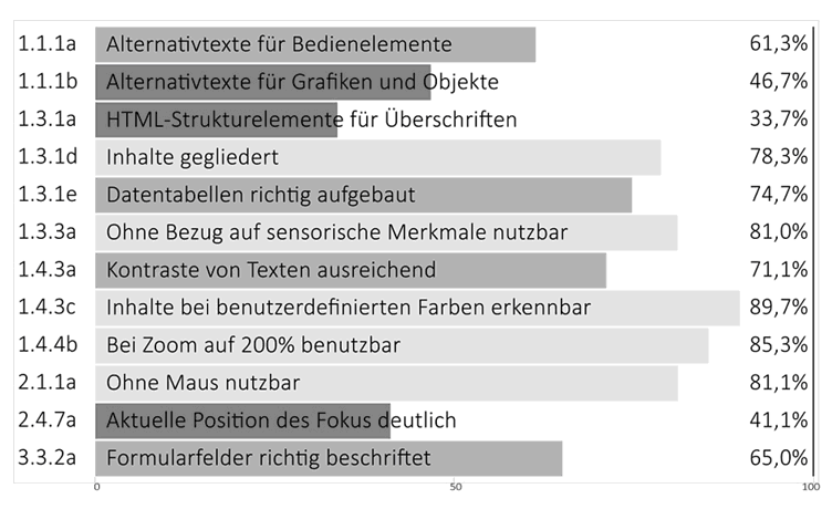 Der hier durchgeführte Schnelltest umfasste 12 Prüfschritte der BITV 2.0 (Abb. 3), die sämtlich der Priorität I (hohe Relevanz) zugeordnet sind. Je Test konnten für die 12 Prüfschritte insgesamt 29 Punkte (= 100 Prozent) erreicht werden, wobei maximale Punktzahlen von 1 bis 3 entsprechend der Gewichtung im BITV-Test vergeben wurden. Die Bewertung zum Erfüllen des jeweiligen Prüfschrittes folgte dem Bewertungsschema der BITV. Als Orientierung für die Auswahl dieser Prüfschritte dienten sog. Basiskriterien der Barrierefreiheit. Diese werden etwa von Hellbusch/Probiesch (2011, 21-24, 63) als "Die sieben Säulen der Barrierefreiheit" bezeichnet und umfassen: