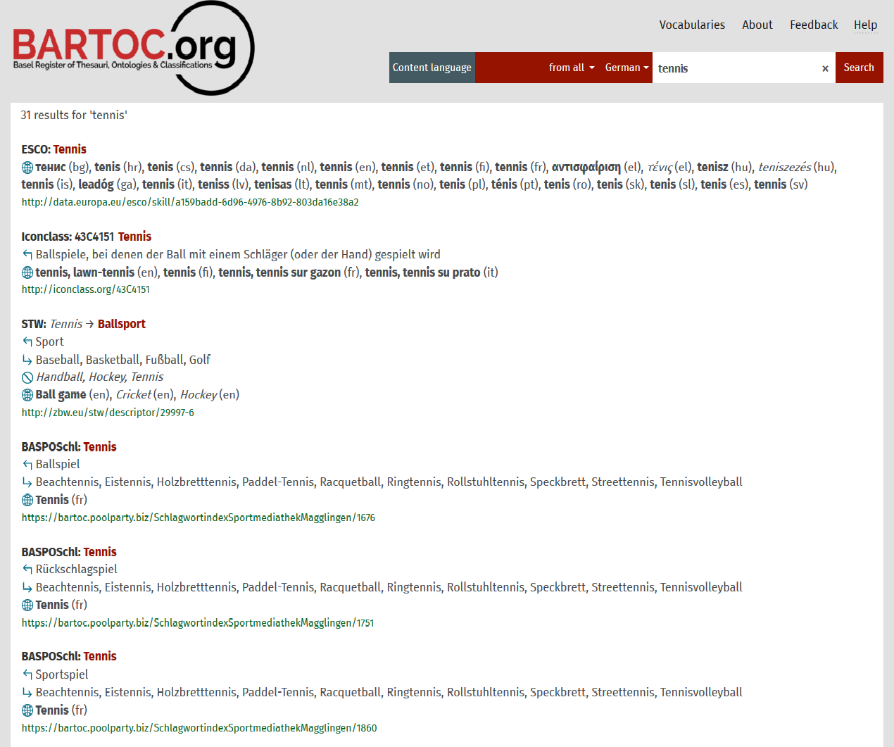 Folgerichtig war die Sportmediathek Magglingen auch erste Ansprechpartnerin für ein Pilotprojekt, als es ab 2017 darum ging, den Funktionsumfang von BARTOC dahingehend zu erweitern, es von einem elementaren in ein vollwertiges Terminologieregister zu transformieren. „Vollwertig“ meint, dass es nicht nur die Metadaten der verzeichneten Wissensorganisationssysteme enthält, sondern auch den Inhalt, d.h. Begriffe, Terme, Klassen usw. der Vokabulare, umfasst (Golub u.a. 2014).