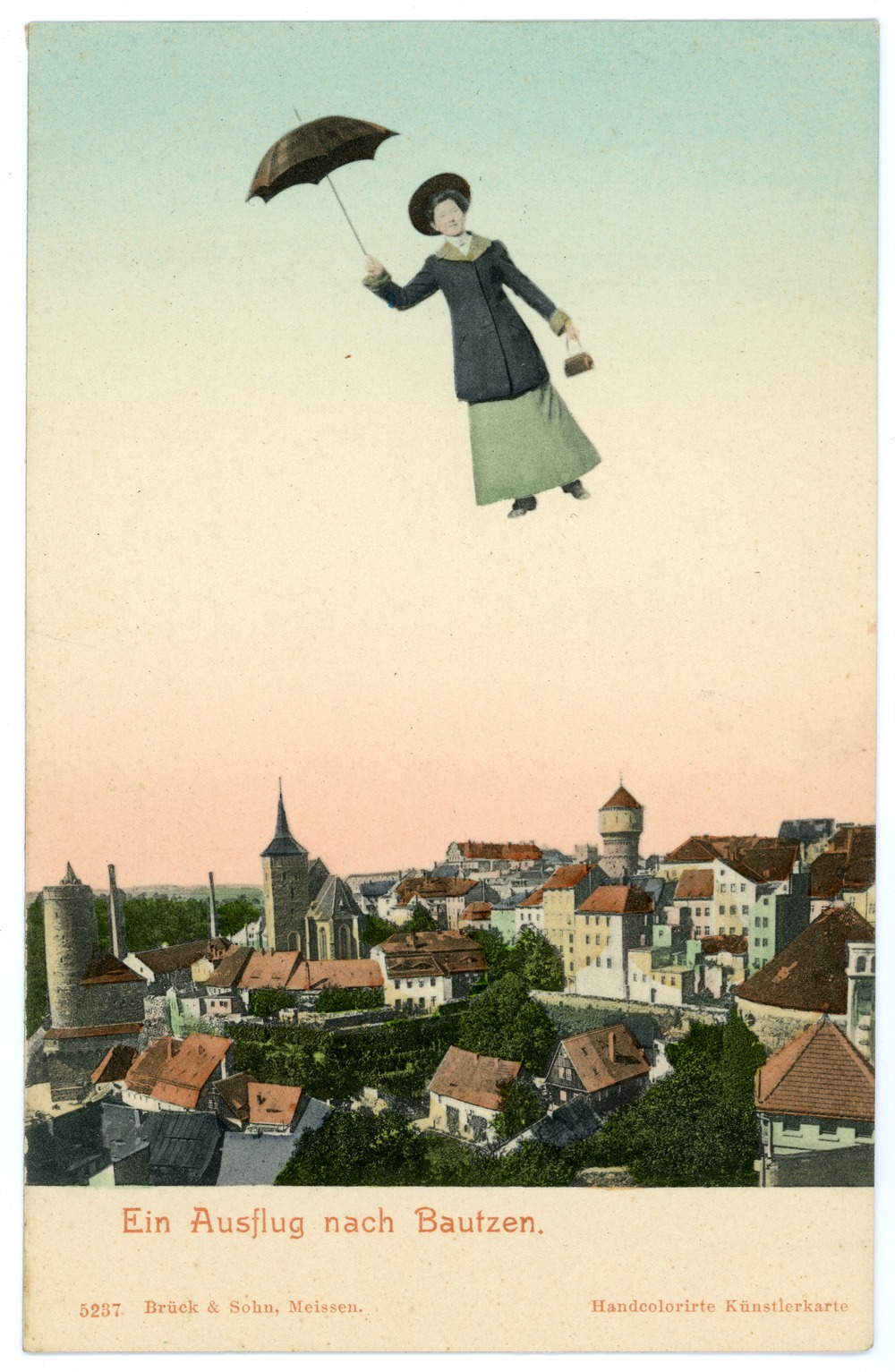 Zugleich offenbaren die Fliegenden Frauen und Männer ein potentielles Forschungs- und Sammelgebiet. Abbildungen fliegender Personen waren in der ersten Jahren nach 1900 auch andernorts beliebte Kartenmotive. Einige dieser Postkarten entstanden möglicherweise in Lizenz und Kooperationen mit dem Meißner Verlag Brück & Sohn. Weitere Motive scheinen von Brück & Sohn gänzlich unabhängig produziert worden zu sein. Wer zuerst eine fliegende Person mit Regenschirm und Tasche in ein Postkartenmotiv montierte ist für den Autor eine noch völlig offene Frage.