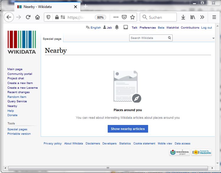 Nearby ist eine Spezialseite von Wikidata, eine Abfrage, die mittels der Geodaten des Internetbrowsers nächstgelegene Datenobjekte anzeigt: z.B. Straßennamen, Gebäude, Kulturdenkmäler, www.wikidata.org/wiki/Special:Nearby – multilinguales Weltwissens der nahen Umgebung.
