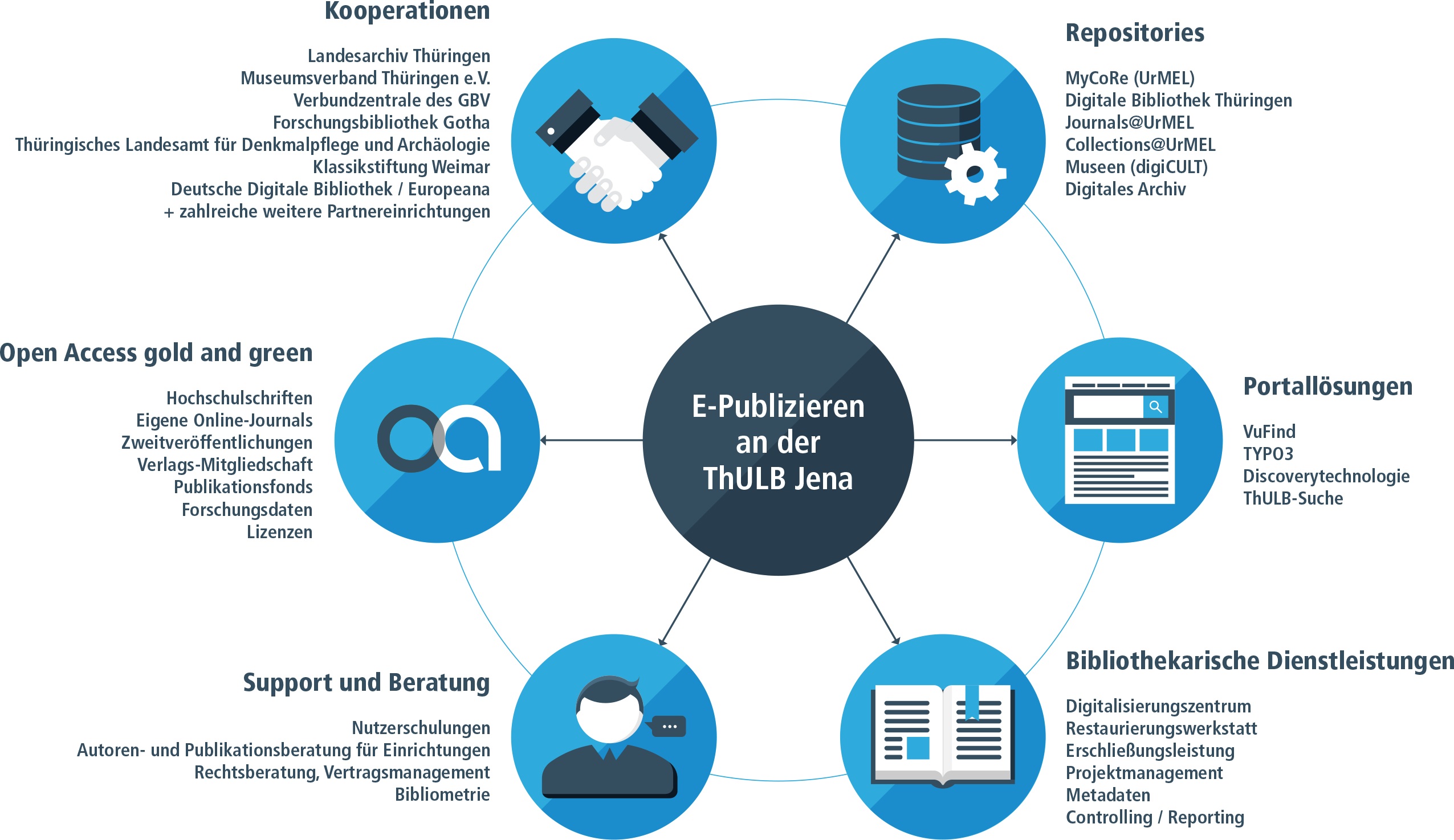Im Rahmen ihrer Publikationsservices stellt die Thüringer Universitäts- und Landesbibliothek Jena diverse Repositorien und Portallösungen für die Aufbereitung digitalisierter Sammlungen zur Verfügung. An der Publikationsinfrastruktur beteiligen sich zahlreiche Wissenschafts- und Kultureinrichtungen. Das Serviceportfolio im Kontext des elektronischen Publizierens umfasst bibliothekarische Dienste und Beratungsangebote. Open Access-Publizieren wird sowohl auf dem grünen als auch dem goldenen Weg unterstützt.