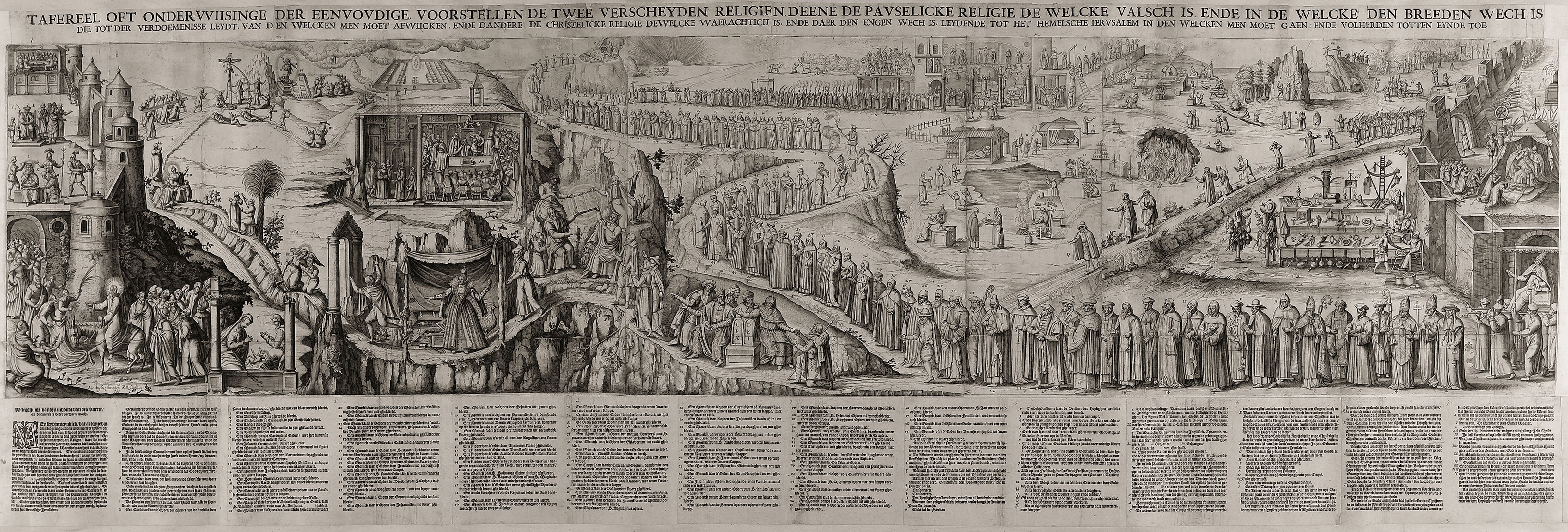 DescriptionFig. 10 Robert Baudous after Nic. Anglois, Tafereel oft onderwiisinge der eenvoudige, voorstellende twee verscheyden religien (Tableau or teaching of the simple, depicting two different religions), ca. 1600, engraving, 430 × 1875 mm. Atlas Van Stolk, Rotterdam, inv. no. 60692