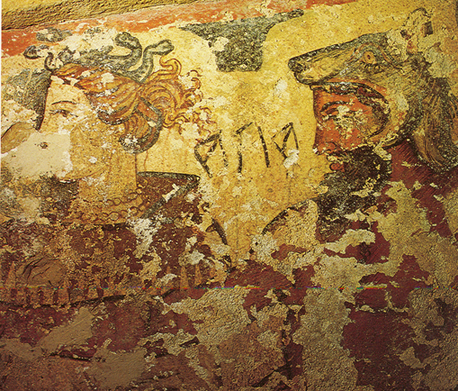 Dieses Phänomen erscheint auch in der etruskischen Grabmalerei des 4. Jhs. v. Chr. Auf einem Fresko aus der Tomba dell Orco II in Tarquinia sieht man die Gesichter von Aita (griechisch Hades) und Phersipnei (griechisch Persephone). Das Inkarnat von Aita ist durch Schattenschraffur und Lichthöhungen plastisch gestaltet, das Gesicht seiner Gefährtin bleibt hingegen flächig und unplastisch, die Mittel der 'optischen Täuschung' wurden hier nicht verwendet (Abb. 8).38