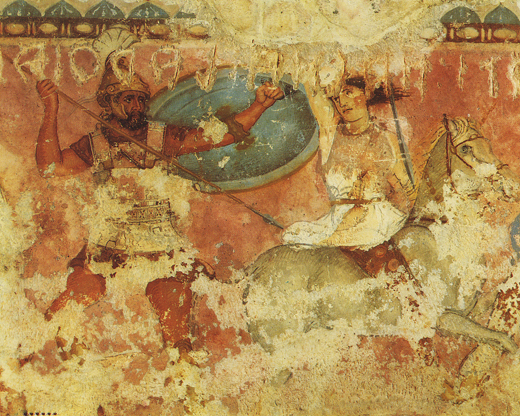 Ein frühes Beispiel, auf dem Männer (die Griechen) und Frauen (die Amazonen) auf gleiche Weise durch Schattenmalerei plastisch gestaltet sind, ist ein großgriechisch-etruskischer Sarkophag aus Tarquinia (heute in Florenz, 3. Viertel 4. Jh. v. Chr.). Sowohl das männliche Inkarnat als auch das weibliche weisen Schraffuren und hellere und dunklere Farbnuancen auf. (Abb. 9) Auch auf dem Wandbild des Persephonegrabes in Vergina (spätes 4. Jh. v. Chr.) sind die Inkarnate von Hades und Persephone mithilfe der Schatten plastisch gestaltet.39 Diese Grabbilder dürften zudem einen wirklich authentischen Einblick in die damals angesehenste Malerei geben. Denn diese Gräber werden plausibel mit dem makedonischen Königshaus in Verbindung gebracht, an dem die größten Maler ihrer Zeit, wie Apelles, arbeiteten. (Abb. 10)